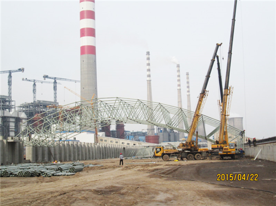 茌平信源铝业干煤棚网壳工程此工程总展开建筑面积约为8万平方米。其中网架重量约为3000吨,网壳跨度112米,矢高40.669米,总长度600米。本次工程施工难度极大,在山东省属于首屈一指的项目,而我司已经全部完成网架的车间制作、现场的拼装,为我司施工史上增添又一辉煌!