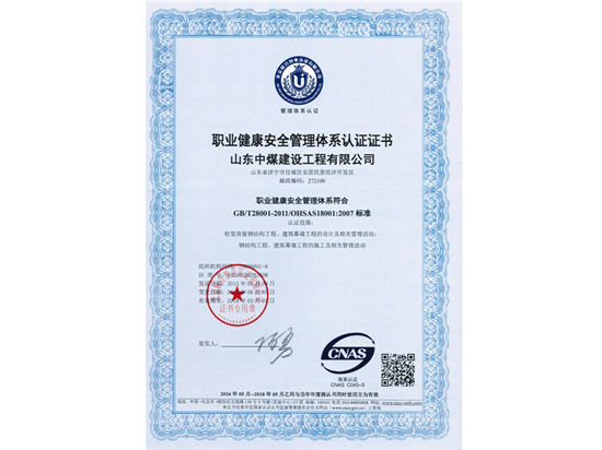 职业健康安全管理体系认证证书